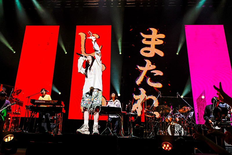 続いて披露された「鮮やかな街」では、ステージ後ろのバックモニターに映し出された歌詞がこの曲の世界観を彩る。モニターの映像やオレンジ色の照明によって視覚的にも「鮮やか」に演出されたことによって、まるで夕焼けの街の中に溶け込むようなノスタルジックな感覚を味わうと、続けて披露された「願い事日記」「シネマ」のような情緒豊かな楽曲が並ぶこのセクションは、aikoが描く歌詞の世界がまるで一本の映画になって届けられたかのような美しい情景が眼前に広がっていた。