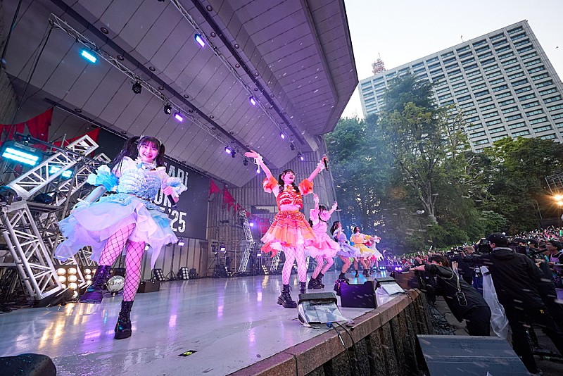 リハーサル終了直後から降り出した雨もすっかり上がり、開演前BGMでシンガロングも発生する野音。開演時間となり、ロックアレンジされた出囃子が鳴り響く中、ステージ脇ではメンバーが円陣を組みながら「東京のど真ん中、ここ日比谷野音で私たちの歌声を響かせるぞー!」と客席に呼びかける。そのままトゲトゲ付きのサングラスをかけた9人がステージへと勢いよく駆け込んでくると、会場から返ってきたのは総立ちの大歓声。さっそく1曲目「いただきランチャー」のイントロが轟き、伊達花彩は「頂を目指している私たちと一緒に、まずはこの曲。お前ら行くぞー!」と絶叫。すでに客席側の興奮もレッドゾーンに突入となり、ロックの聖地にふさわしく、激しいコールの応酬からのライブスタートとなった。