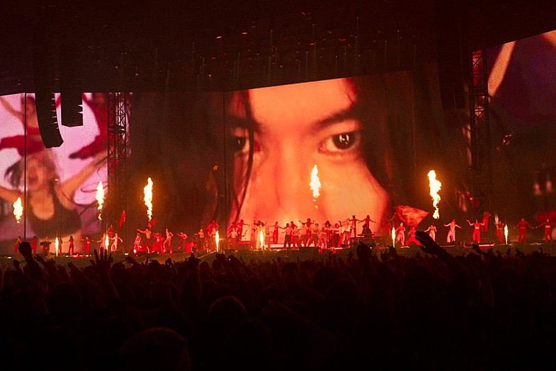 やはり最初の山場はこの曲だろう。NHK連続テレビ小説「虎に翼」の主題歌として人気を博し、言わずと知れた代表曲へと成長した「さよーならまたいつか!」である。袴姿で踊るダンサーたちは絢爛そのもの、満員の東京ドームを華麗に魅了していく。それにしても、〈空に唾を吐く〉と歌う時の濁った声と、サビを終える時の美しいファルセットの対比である。そのコントラストがこの楽曲の魅力になっていることは疑いようもなく、東京ドームという大舞台においても、改めてその声にハッとさせられるのである。紙吹雪は100年先の未来まで祝福する光の粒のように降り注ぎ、最後は恒例のピースで締め。響き渡る歓声があたたかく会場を包んでいた。