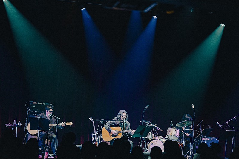 歌をじっくり聴かせるだけではなく、このバンドの身上であるロックンロールもしっかりと体感することができた。そのことを象徴していた曲の一つが「アジアの王様」。やはり原曲よりもテンポを落としているのだが、心地よくグルーヴするベースライン、ドライブ感たっぷりのドラム、歌心を感じさせるアコギが共鳴し、極上のロックンロールが出現。観客も身体を揺らし、サビのメロディを口ずさみながらバンドとの“セッション”を楽しんでいた。楽曲によってはナガマツがカホンを演奏する場面も。メンバー3人の生音の響きを直接味わえたのも、今回の公演の大きな収穫だったと思う。